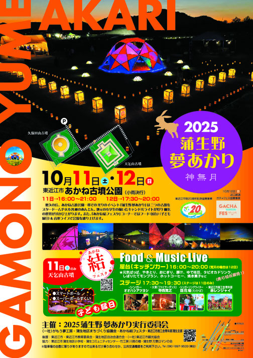 悠久の丘、あかね古墳公園一帯での光りのイベント「蒲生野夢あかり」は二つの古墳をスタードームや大小各種のあんどん、地元の小学生の描いたキャンドルライトがともり幽玄の世界が浮かび上がります。また、「あかね結フェスタ」コーナーでは、フード(屋台)(子ども縁日)&音楽ライフで会場を盛り上げます。